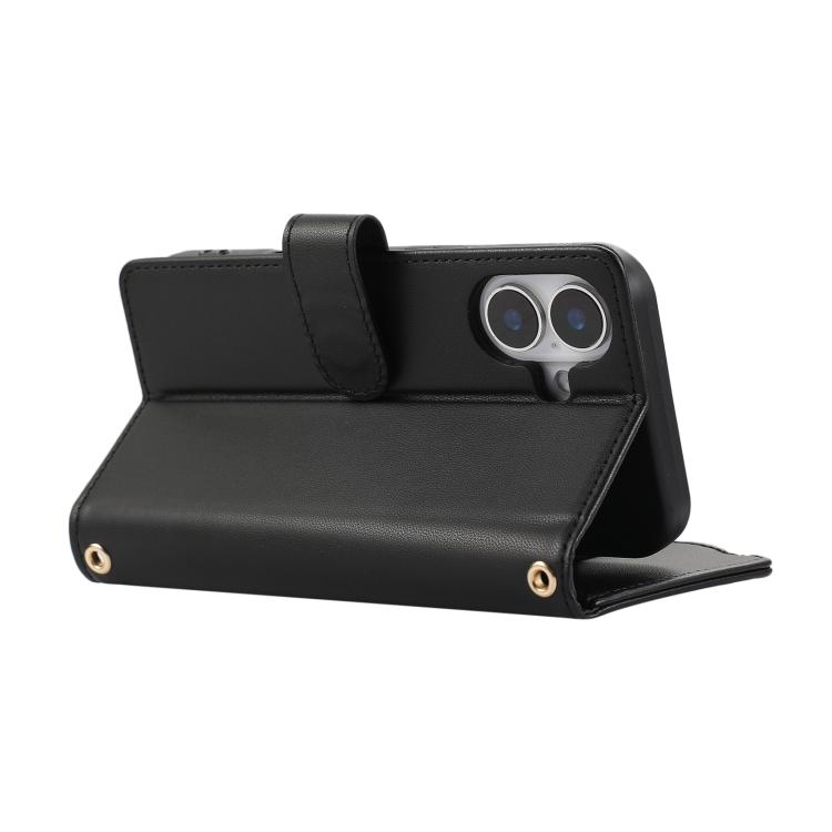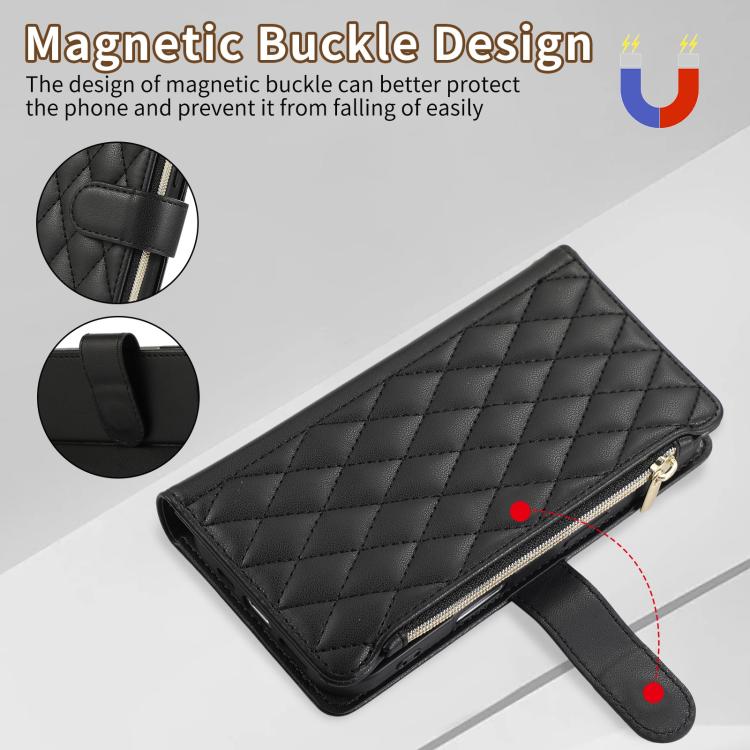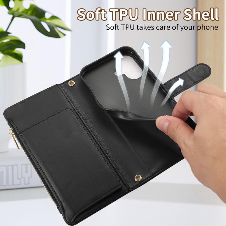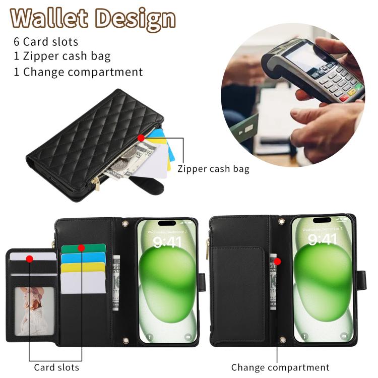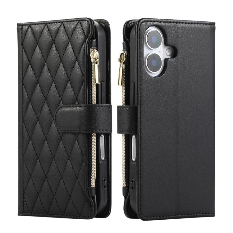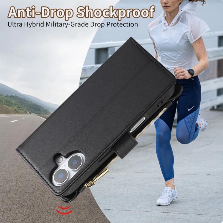 Funda de Cuero Tipo Billetera con Cremallera Rombal para iPhone 16 Plus (Negra)