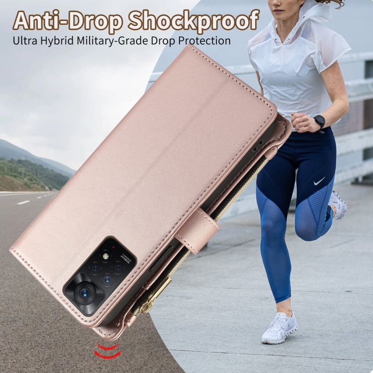 Funda de Cuero Tipo Billetera con Cremallera Rombal para Redmi Note 11 Pro 4G (Oro Rosa)