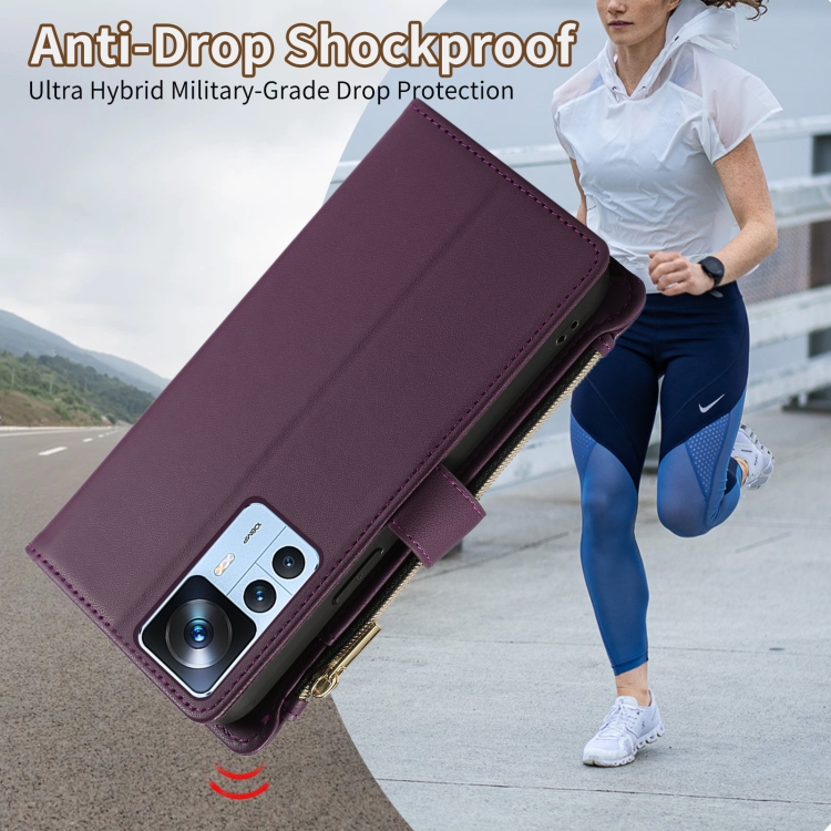Funda de Cuero Tipo Billetera con Cremallera Rombal para Xiaomi 12T/12T Pro (Morado Oscuro)