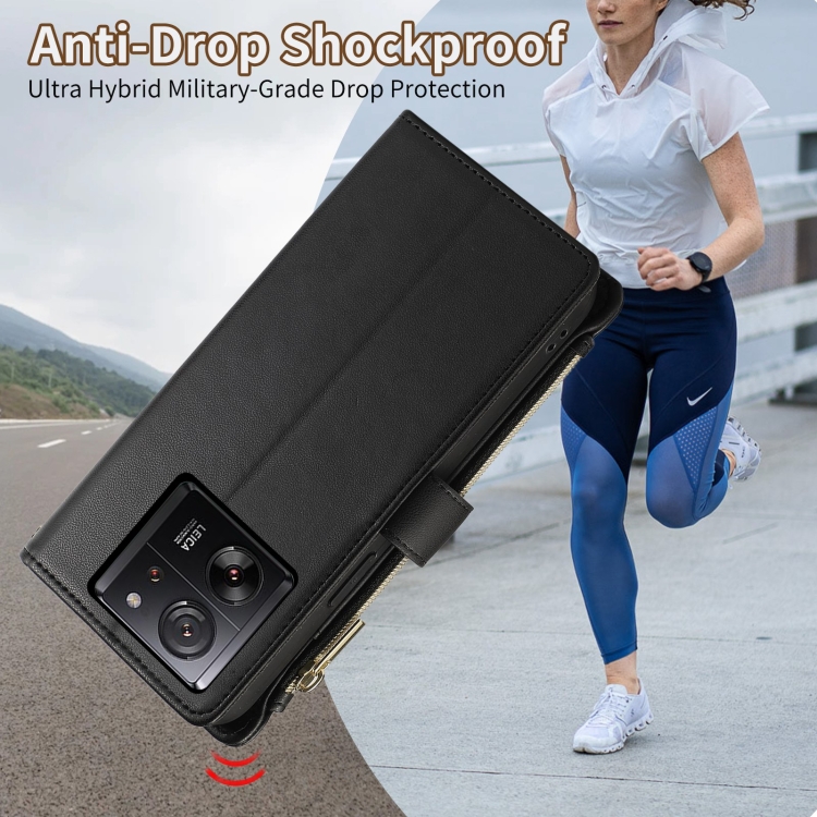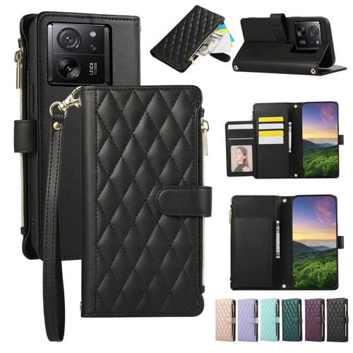 Funda de Cuero Tipo Billetera con Cremallera Rombal para Xiaomi 13T/13T Pro (Negra)