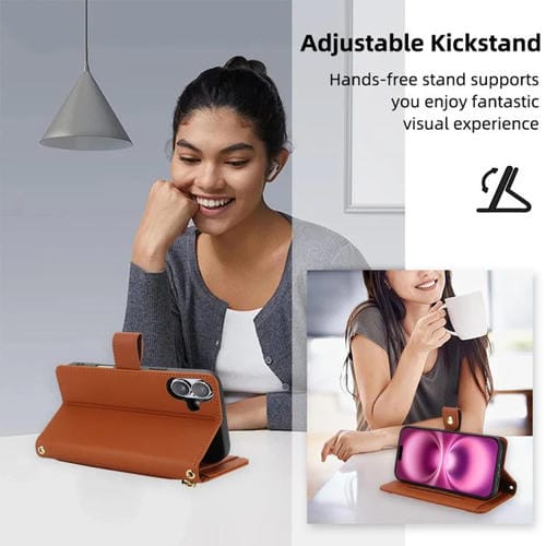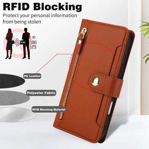 Funda de cuero tipo billetera con cremallera y siete ranuras para tarjetas para iPhone 17 (marrón)