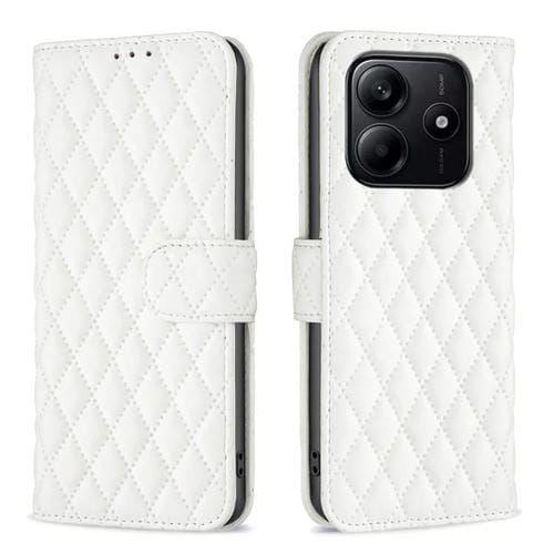Funda de Cuero Tipo Billetera con Tapa y Diseño de Celosía En Forma de Diamante para Redmi Note 14 4G (Blanca)