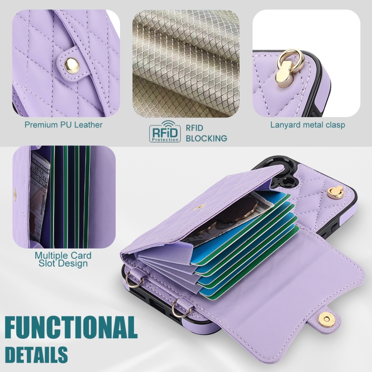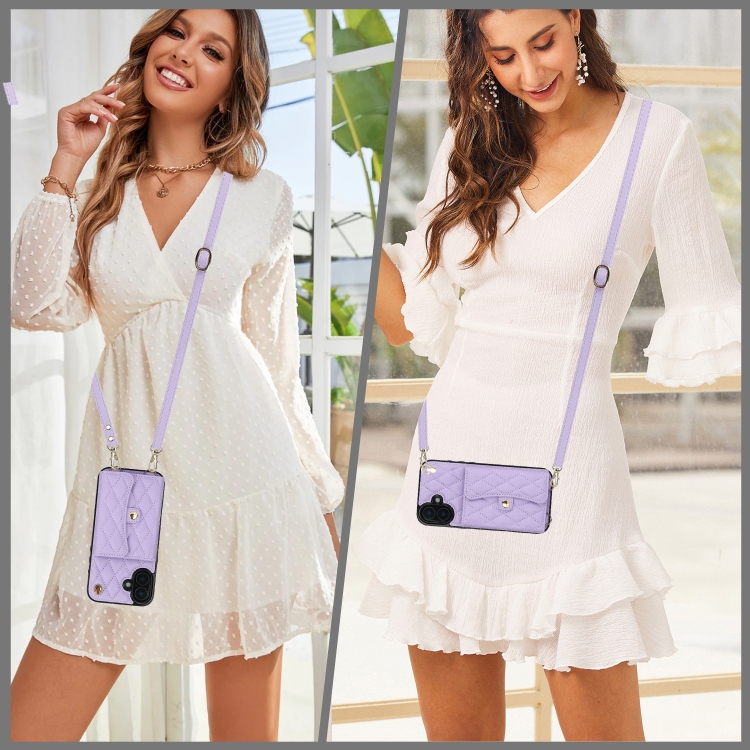 Funda Tipo Billetera Cuero iPhone 16 Diseño de Rombos Bandolera (Morado)