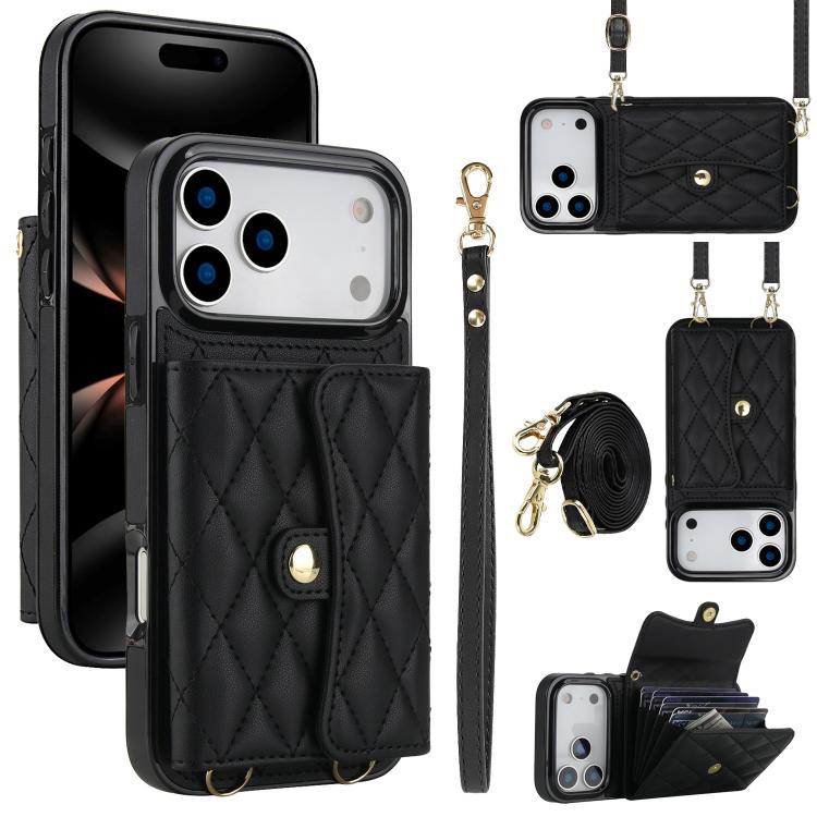 Funda de cuero tipo cartera horizontal con diseño rómbico cruzado para iPhone 17 Pro Max (negra)