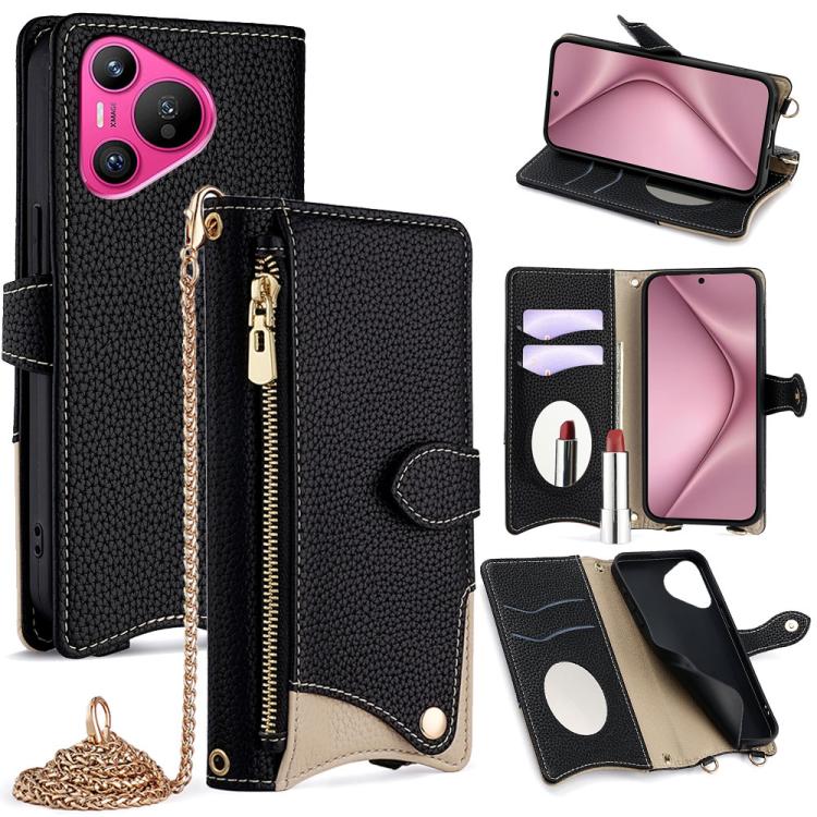 Funda de Cuero Tipo Lichi con Forma de Cola de Pez y Cadena Cruzada para Huawei Pura 70 (Negra)