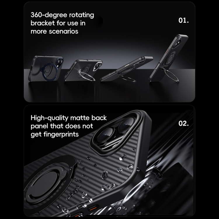 Funda de Fibra de Carbono Magsafe para iPhone 16 con Soporte Giratorio de 360 Grados (Negra)