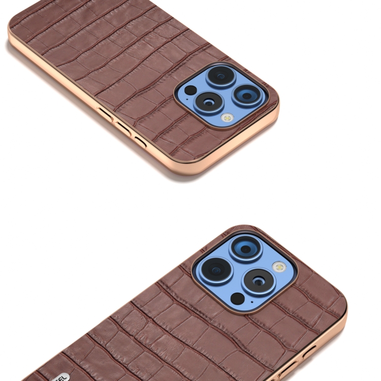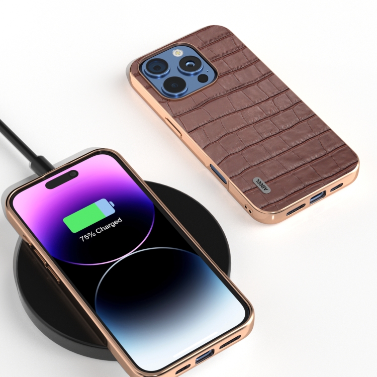 Funda de piel auténtica Abeel para iPhone 16 Pro con textura de cocodrilo y marco galvanizado (Marrón)