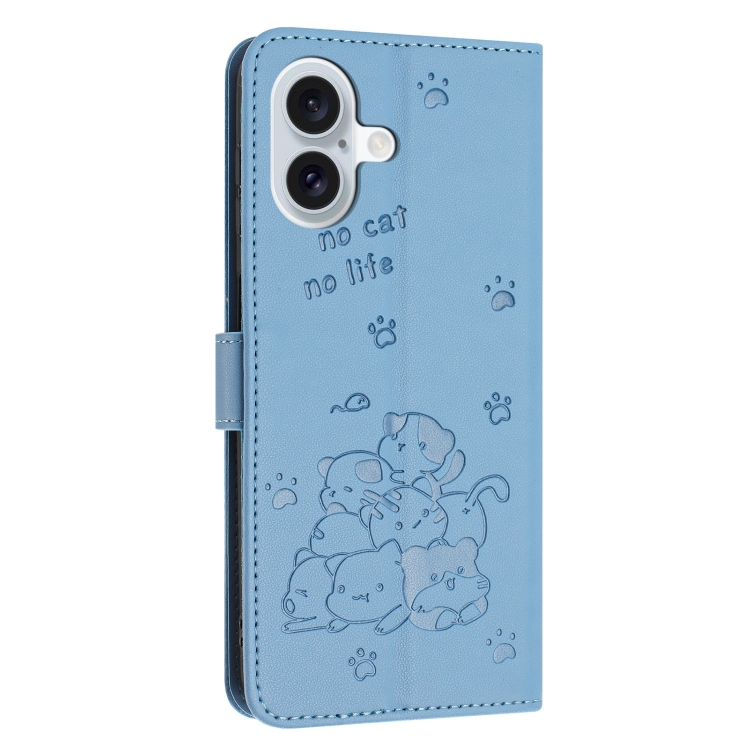 Funda de Piel para iPhone 16 Plus con Diseño de Gatito En Relieve y Cordón (Azul)
