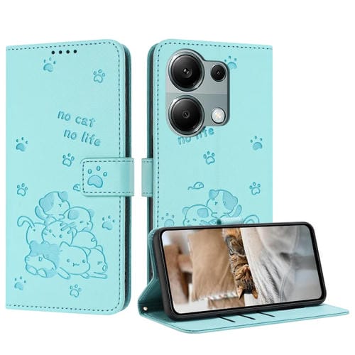 Funda de Piel con Diseño de Gatito En Relieve y Cordón para Xiaomi Poco M6 Pro 4G (Verde Menta)