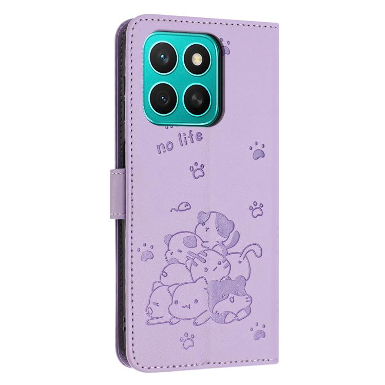Funda de Piel para Honor X8C 4G con Diseño de Gatito en Relieve y Cordón (Morado)