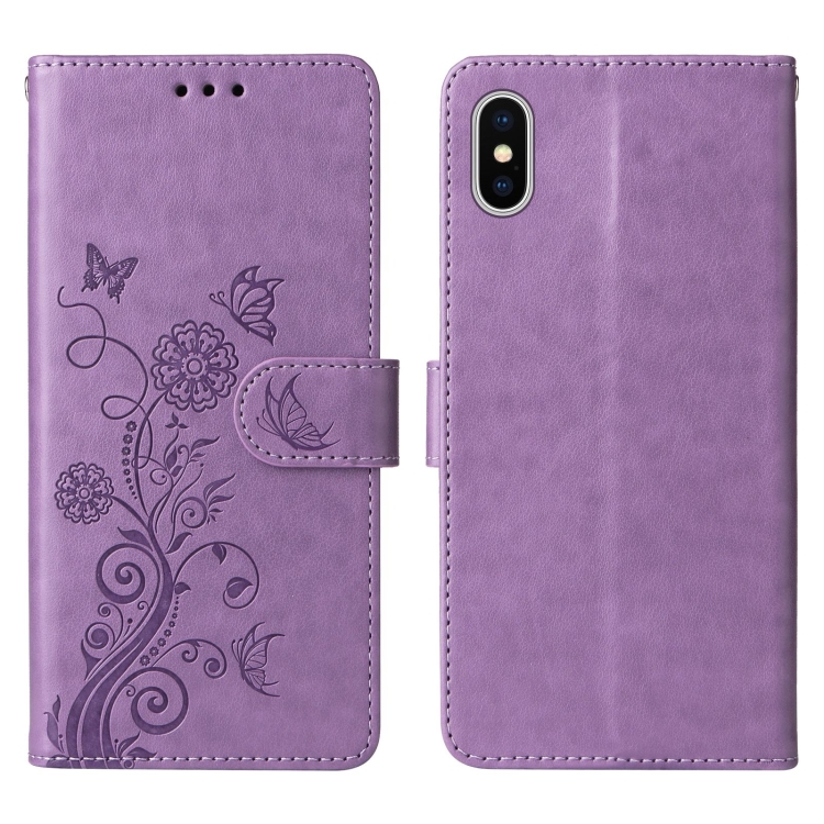 Funda de Piel iPhone Xs Max Diseño Mariposas y Flores En Relieve (Morado)