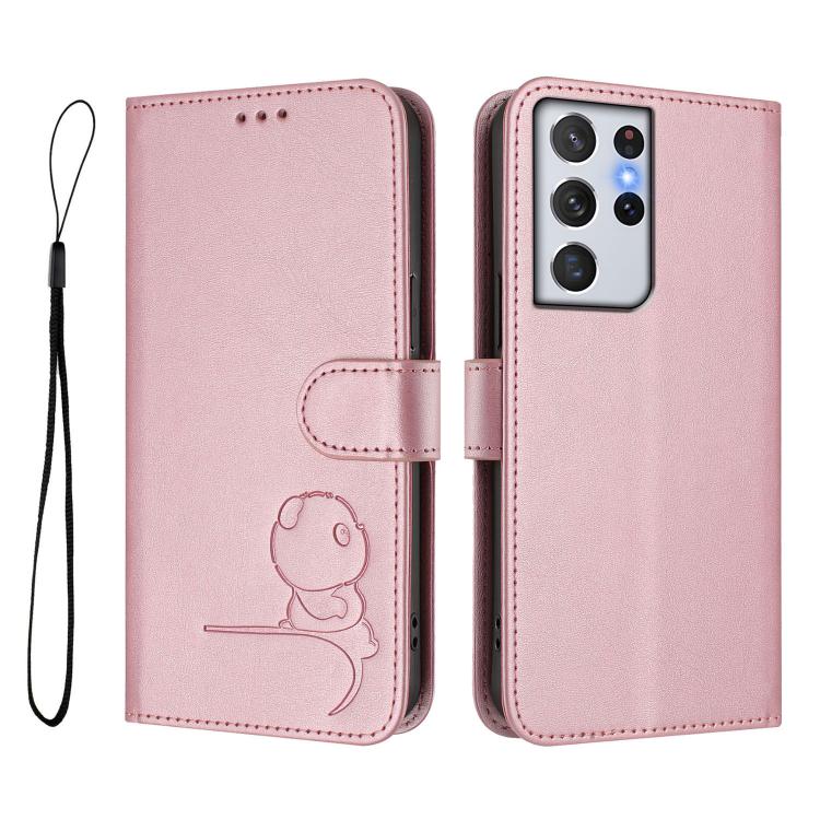 Funda de piel con estampado de panda y RFID para Samsung Galaxy S21 Ultra 5G con cordón (rosa)