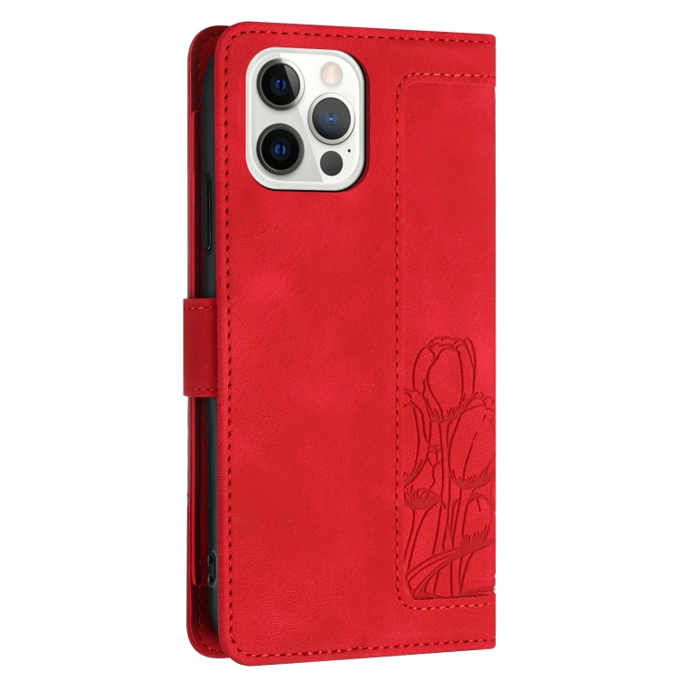 Funda de Piel con Relieve de Tulipanes para iPhone 12/12 Pro con Cordón (Rojo)