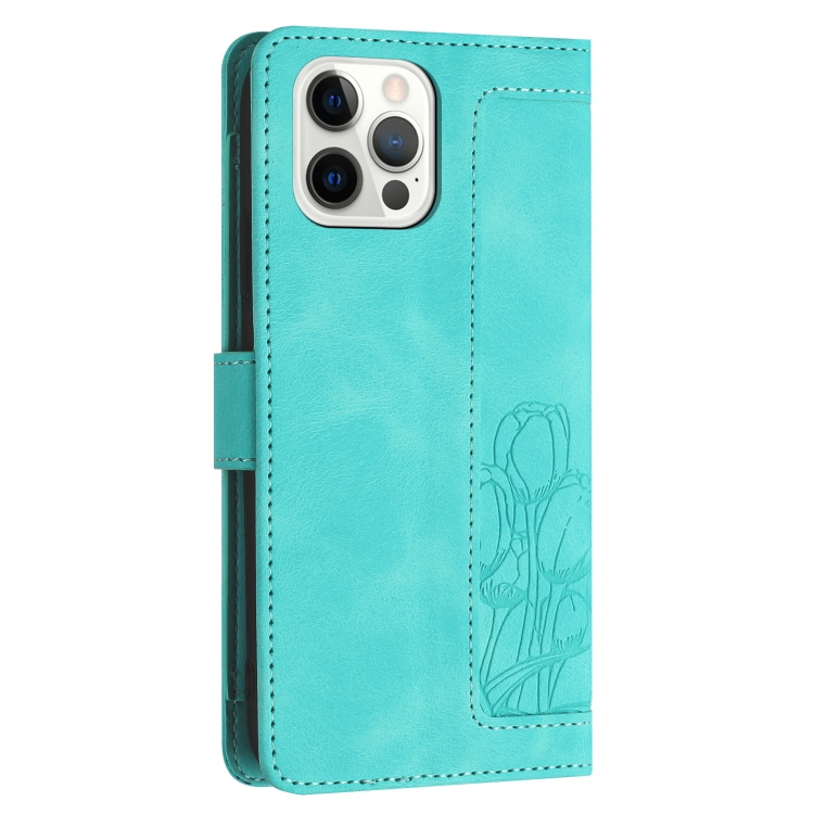 Funda de Piel con Relieve de Tulipanes para iPhone 12/12 Pro con Cordón (Verde)