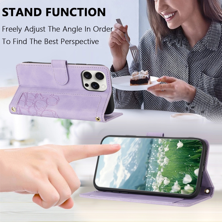 Funda de Piel con Relieve de Tulipanes para iPhone 14 Pro con Cordón (Morado)