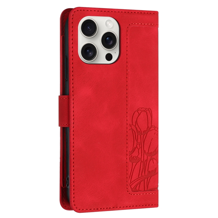 Funda de Piel con Relieve de Tulipanes para iPhone 14 Pro con Cordón (Rojo)