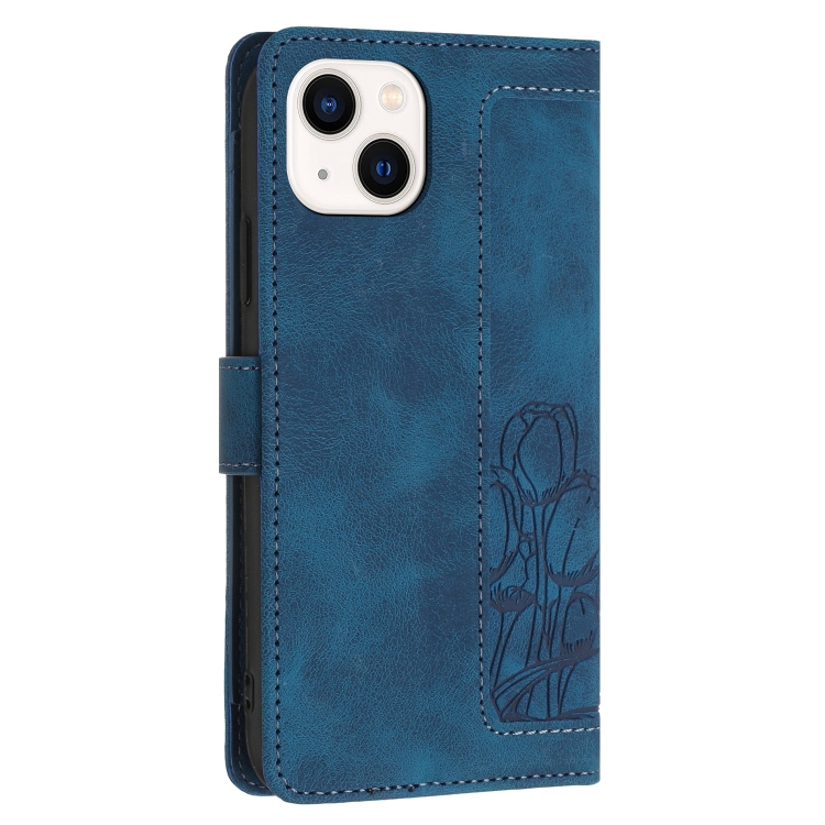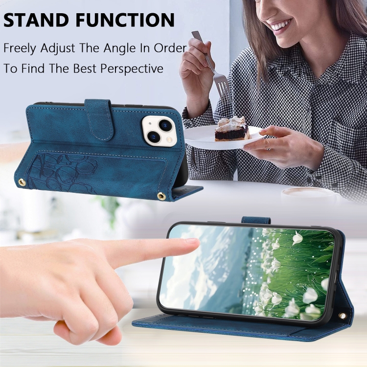 Funda de Piel con Relieve de Tulipanes para iPhone 15 con Cordón (Azul)