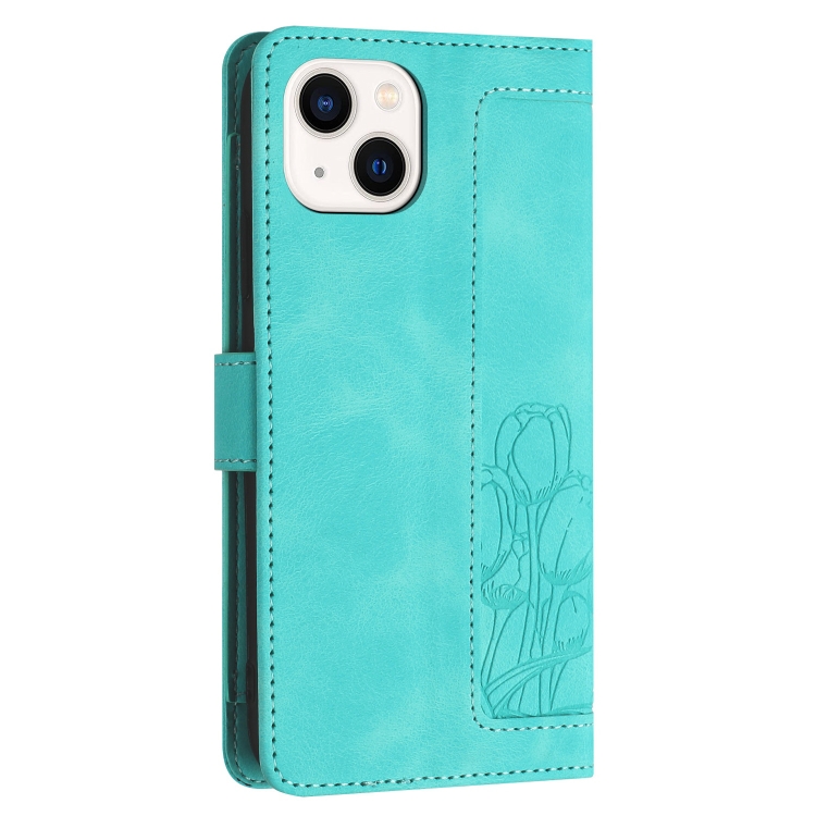 Funda de Piel para iPhone 15 con Relieve de Tulipanes y Cordón (Verde)
