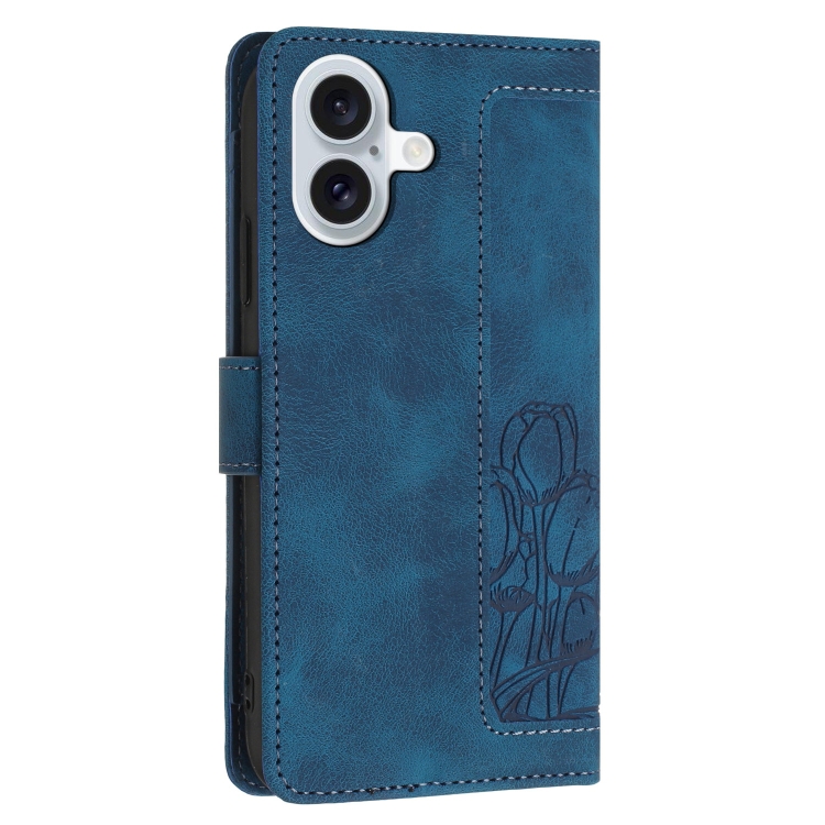 Funda de Piel con Relieve de Tulipanes para iPhone 16 con Cordón (Azul)