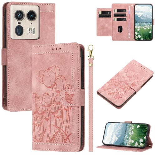 Funda de Piel con Relieve de Tulipanes para Motorola Edge 50 Ultra con Cordón (Rosa)