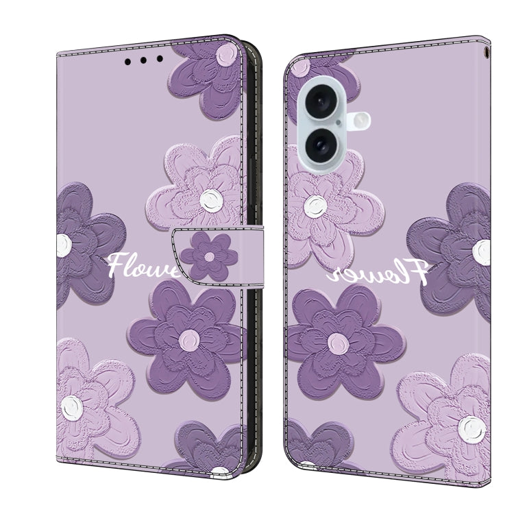 Funda de Piel para iPhone 16 Pintada a Mano con Flores (Morado Oscuro)