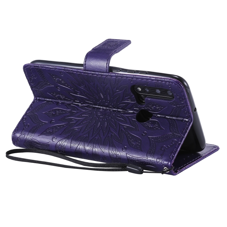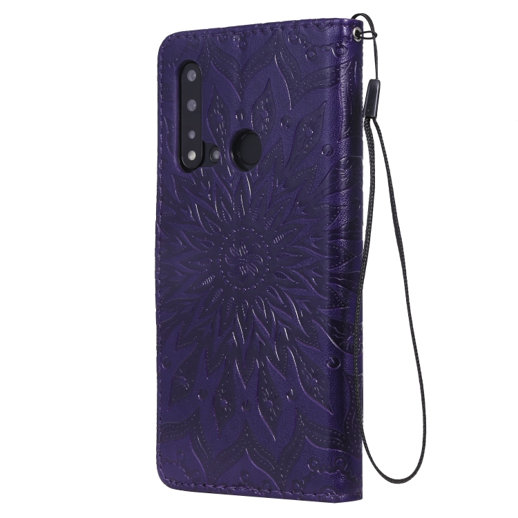Funda Piel Sintética Huawei Nova 5I / P20 Lite (2019) con Estampado Girasol, Soporte, Ranuras y Cordón (Morado)