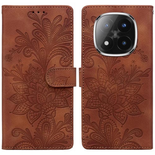Funda de Teléfono con Hebilla Magnética de Pu con Encaje Floral En Relieve y Correa para la Muñeca para Redmi Note 14 Pro / Note 14+ (Marrón)