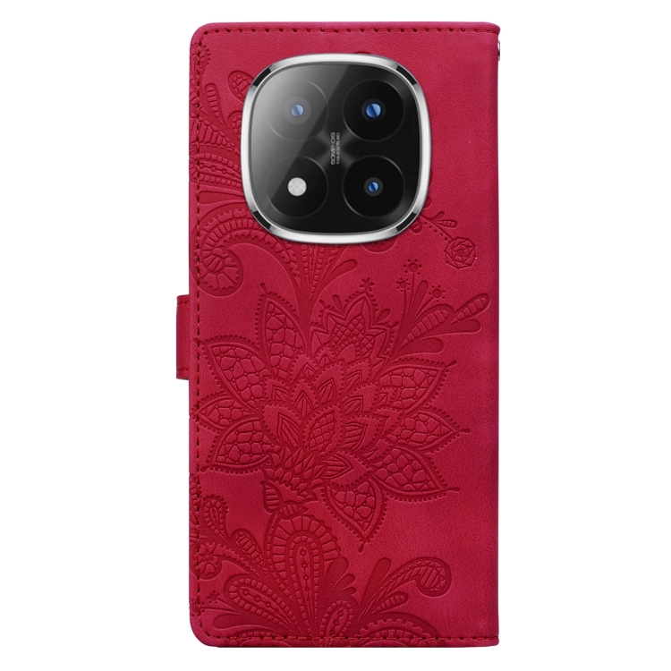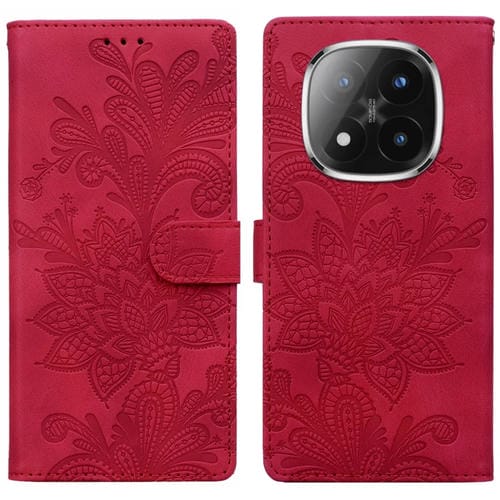 Funda de Teléfono con Hebilla Magnética de Pu con Encaje Floral En Relieve y Correa para la Muñeca para Redmi Note 14 Pro / Note 14+ (Rojo)