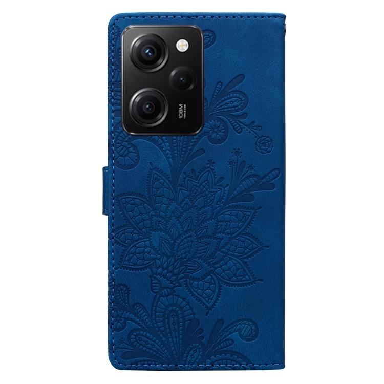 Funda de Teléfono con Hebilla Magnética y Encaje Floral En Relieve para Redmi Note 12 Pro 5G Global con Correa para la Muñeca (Azul)
