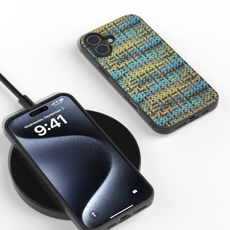 Funda de teléfono PU con marco negro y enrejado para iPhone 16 Plus (Dorado)