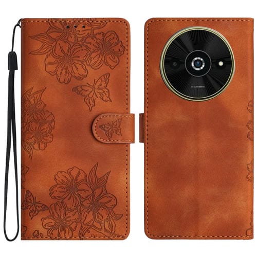Funda de Teléfono de Pu con Relieve de Piel de Mariposa y Diseño de Flor de Cerezo para Xiaomi Poco C61 (Marrón)
