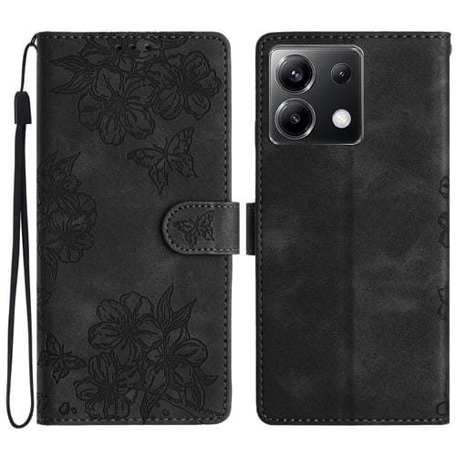 Funda de Teléfono de Pu con Relieve de Piel de Mariposa y Diseño de Flor de Cerezo para Xiaomi Poco X6 (Negro)