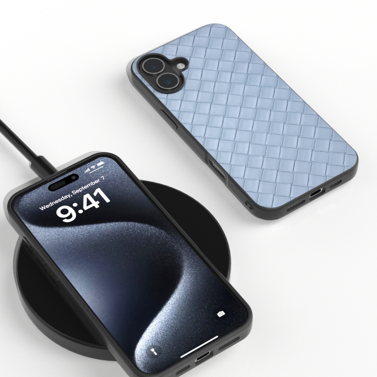 Funda de teléfono PU con textura tejida y marco negro para iPhone 16 Plus (Azul Claro)