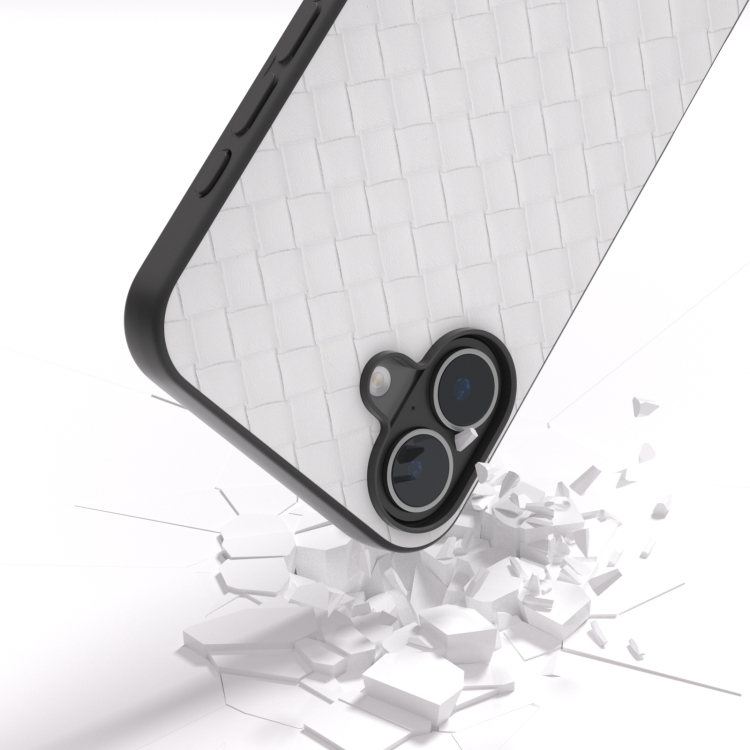 Funda de teléfono PU con textura tejida y marco negro para iPhone 16 Plus (Blanca)