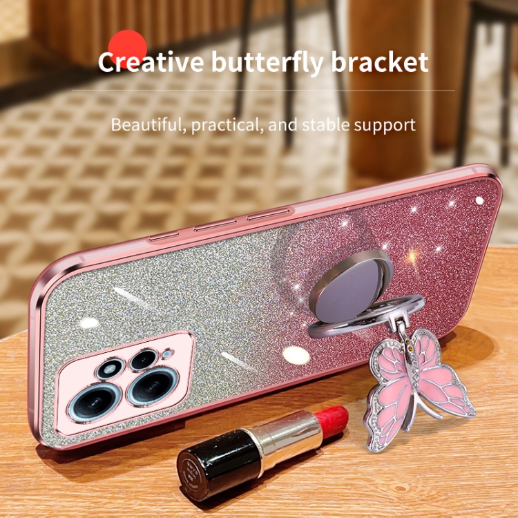 Funda de Teléfono de TPU con Soporte para Mariposa con Purpurina Degradada y Chapada Global para Redmi Note 12 4G (Plateada)