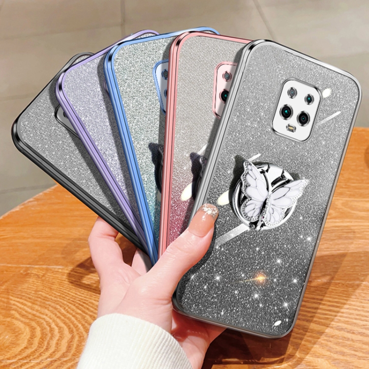Funda de Teléfono de TPU con Soporte para Mariposas y Purpurina Degradada Chapada para Redmi 10X Pro 5G (Azul Sierra)
