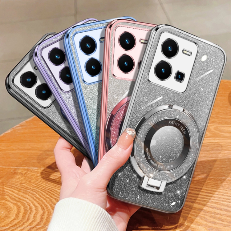 Funda de Teléfono de TPU con Soporte Redondo y Purpurina Degradada Chapada para Vivo Y35 Global 2022 (Negra)