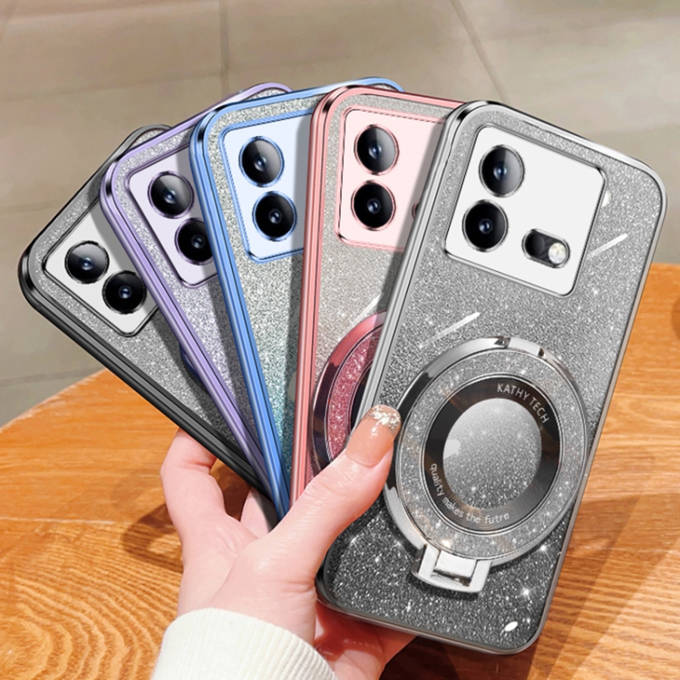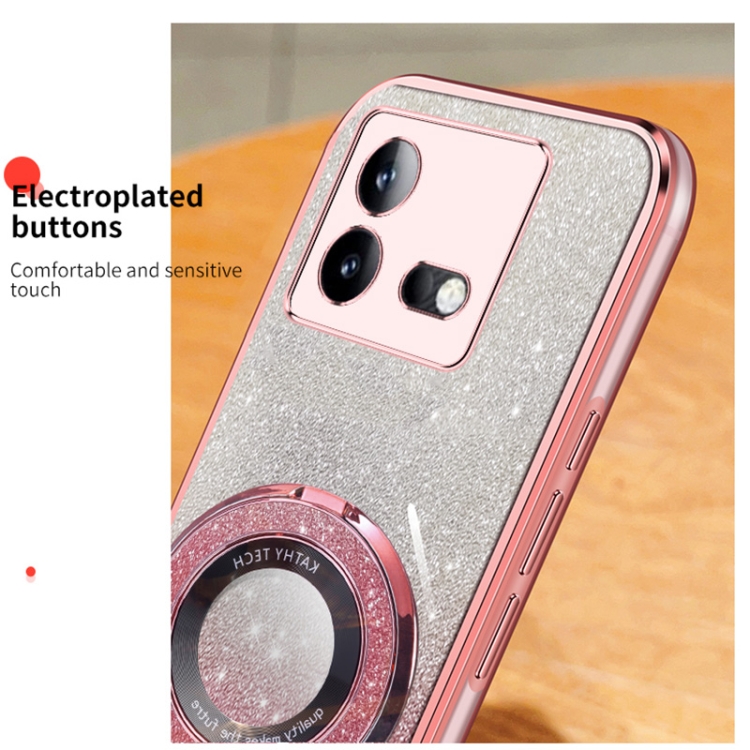Funda de Teléfono de TPU con Soporte Redondo y Purpurina Degradada Plateada para Vivo Iqoo Neo8/Neo8 Pro (Rosa)
