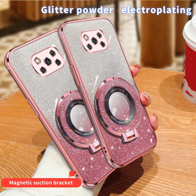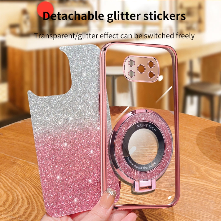 Funda de Teléfono de TPU con Soporte Redondo y Purpurina Degradada Plateada para Xiaomi Poco X3/X3 Pro (Rosa)