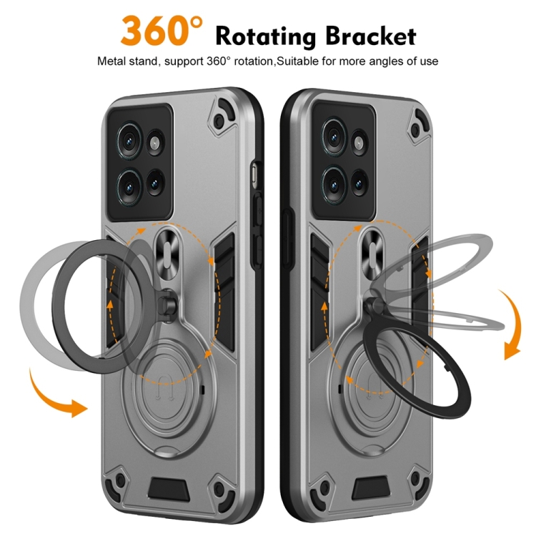 Funda híbrida TPU y PC con soporte giratorio 360° y anillo metal para Motorola Edge 50 (Gris Plateado)
