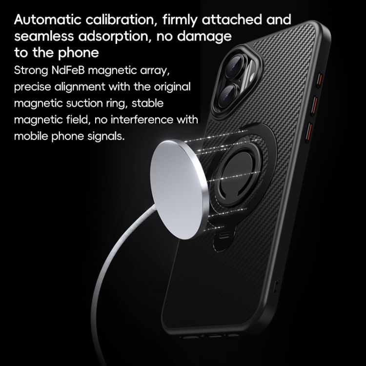 Funda de Teléfono Magsafe Fibra de Carbono para iPhone 16 Plus con Soporte Giratorio 360 (Negro y Azul)