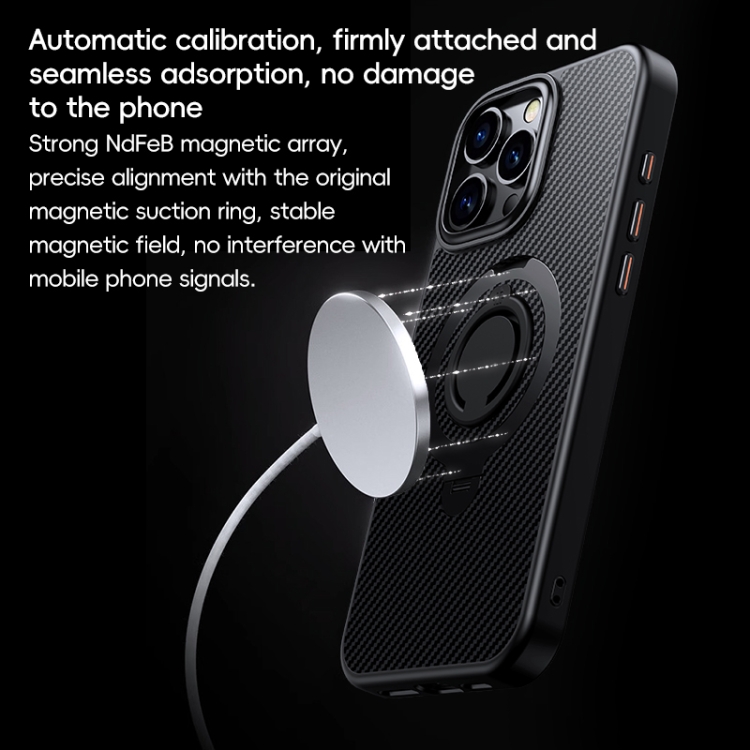 Funda de Teléfono Magsafe Fibra de Carbono iPhone 16 Pro Soporte Giratorio 360 (Negro y Gris)