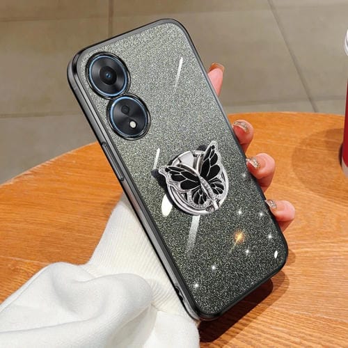 Funda de TPU con Soporte para Teléfono con Diseño de Mariposa y Purpurina Degradada para Oppo A58 5G (Negra)