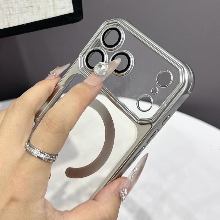 Funda de TPU electrochapada mate MagSafe con ventana grande y correa de mano para iPhone 17 Pro Max (plateada)