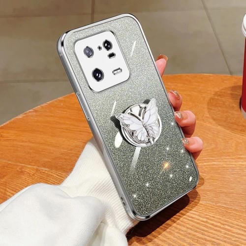 Funda de TPU para Teléfono con Soporte de Mariposa con Purpurina Degradada Plateada para Xiaomi 13 Pro (Plateada)