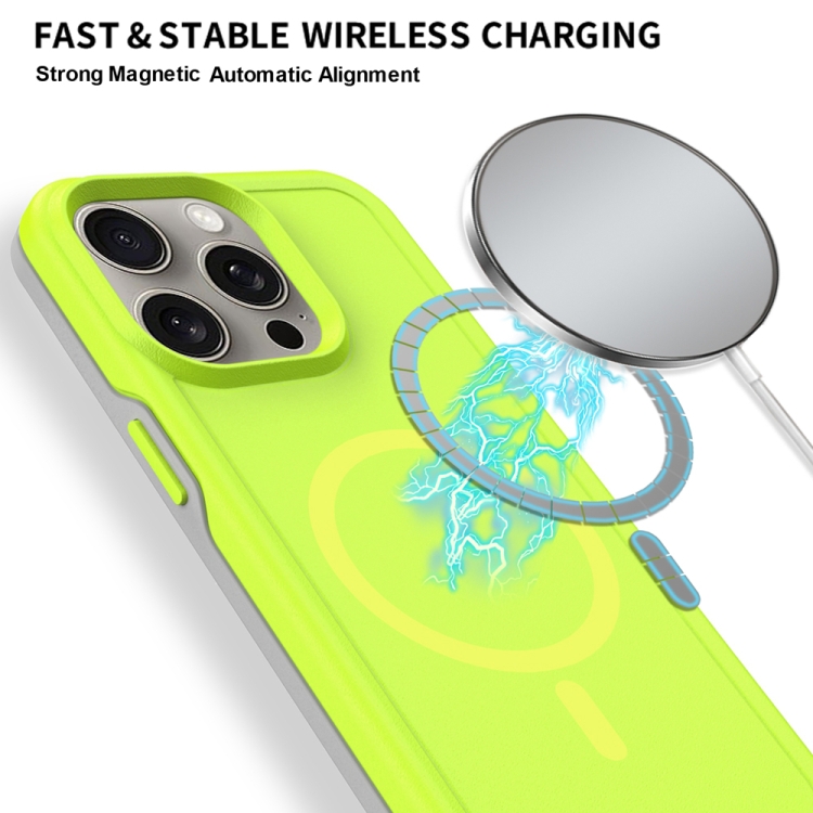 Funda híbrida TPU y PC iPhone 15 Pro protección Magsafe a prueba de golpes (Verde Fluorescente y Gris)