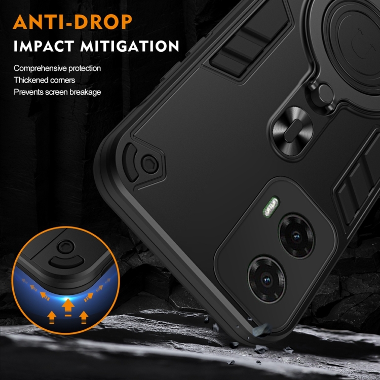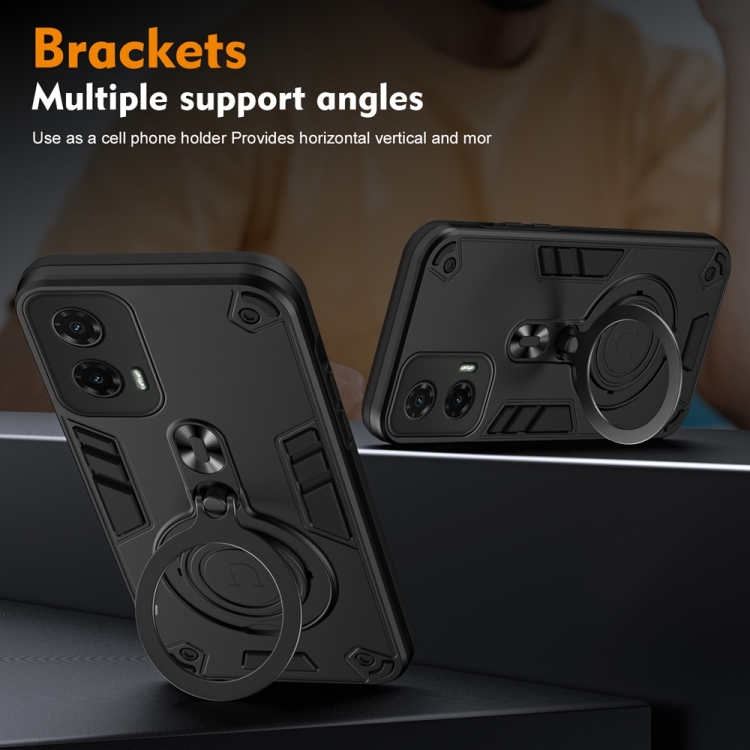 Funda híbrida TPU y PC con soporte giratorio 360° y anillo metal para Motorola Moto G35 (Negro)