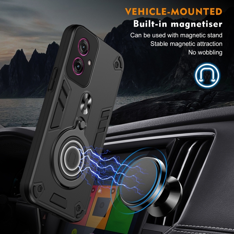 Funda híbrida TPU y PC con soporte giratorio 360° y anillo metal para Motorola Moto G55 (Negro)