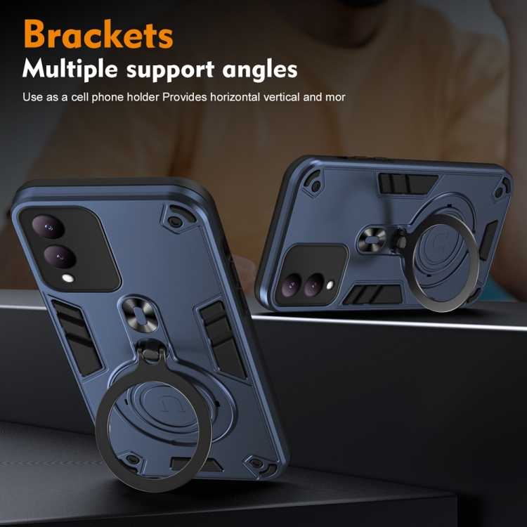 Funda Híbrida de TPU y PC con Soporte Giratorio de 360 Grados y Anillo de Metal para Vivo Y17S (Azul Marino)