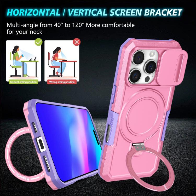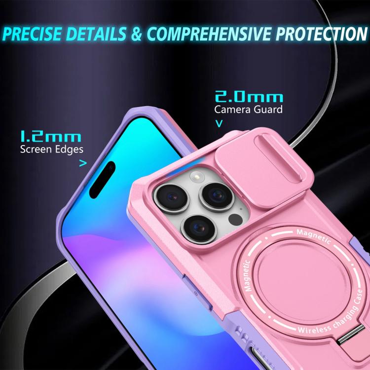 Funda híbrida TPU y PC con soporte Magsafe y protección deslizante para iPhone 16 Pro (Morado y Rosa)
